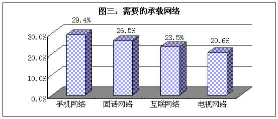 隨著各項(xiàng)增值業(yè)務(wù)的飛速發(fā)展,承載這些業(yè)務(wù)的網(wǎng)絡(luò)的格局也在靜悄悄地“變”。用戶選擇“最需要的承載”結(jié)果如圖三,雖然被調(diào)查者選擇“手機(jī)網(wǎng)絡(luò)”、“固話網(wǎng)絡(luò)”、“互聯(lián)網(wǎng)絡(luò)”和“電視網(wǎng)絡(luò)”的百分比十分接近,但是我們亦不難發(fā)現(xiàn)潛在的格局變化。