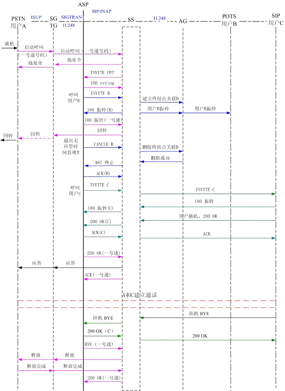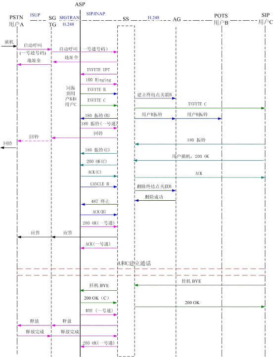 圖5為PSTN用戶A撥打一號通用戶,順呼軟交換域AG下POTS用戶B和SIP用戶C,其中軟交換和應(yīng)用服務(wù)器以SIP協(xié)議相連,軟交換和AG、軟交換和TG以H.248協(xié)議相連?梢钥吹,用戶B首先振鈴,振鈴達(dá)到規(guī)定時(shí)間后,應(yīng)用服務(wù)器取消了對用戶B的振鈴,轉(zhuǎn)而對用戶C振鈴。用戶C摘機(jī)應(yīng)答,通話結(jié)束,用戶C掛機(jī),系統(tǒng)釋放了呼叫。