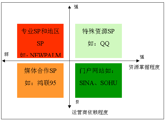 通過提供網絡服務產生強大流量帶動無線業(yè)務發(fā)展,業(yè)務收入主要來源網站推廣,產品常圍繞自有網絡內容策劃、主要收入來自圖鈴、社區(qū)等網絡特點鮮明的業(yè)務:搜狐、新浪、網易、TOM;