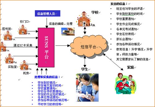 從上圖可以看到,在建立了SUNS校園綜合管理短信平臺以后,學(xué)生在校的活動可以通過信息采集系統(tǒng)收集,在進(jìn)行后臺信息處理的同時(shí),建立一個(gè)與學(xué)生家庭直接溝通渠道。