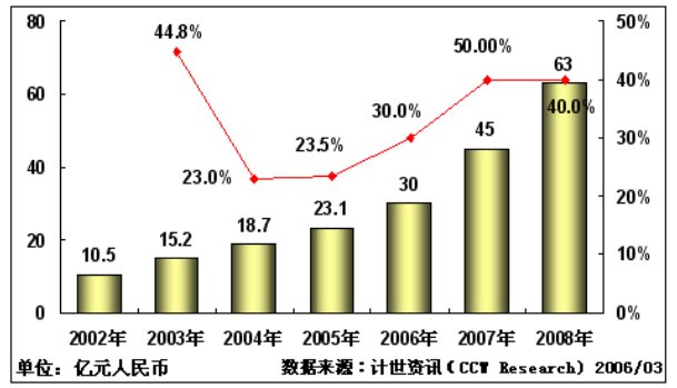 計(jì)世資訊(CCW Research)預(yù)測認(rèn)為,2006年和2007年視頻會議市場將以30%和50%的增長率飛速增長。市場規(guī)模分別達(dá)到30億和45億人民幣。而2008年隨著奧運(yùn)建設(shè)的告一段落,整個(gè)市場將進(jìn)入一個(gè)消化調(diào)整期,市場發(fā)展速度則逐步開始放慢。