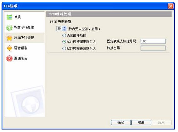如果你使用的電話交換機比較簡單,沒有內(nèi)置有語音引導號碼,你可以使用 ITA的轉(zhuǎn)接任意電話功能來實現(xiàn),設(shè)置0秒啟動,將轉(zhuǎn)接密碼置為空,配置如下:
