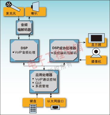 看看第一代可視電話所采用的架構(gòu),我們可以發(fā)現(xiàn)采用了不同的處理器分別用于語音、視頻和系統(tǒng)控制功能。因?yàn)樘幚硇枰,一般采用針?duì)密集媒體處理運(yùn)算(數(shù)字信號(hào)處理或DSP)優(yōu)化的處理器。例如:一個(gè)DSP用來處理語音處理功能,包括語音編碼/解碼、音調(diào)發(fā)生和檢測(cè)、回聲消除以及噪聲消減;一個(gè)DSP或?qū)S脜f(xié)處理器來處理視頻編碼和解碼;一個(gè)應(yīng)用處理器管理VoIP通話控制協(xié)議以及用戶界面(見圖1)。這種方式需要多個(gè)編程模型和開發(fā)工具鏈,這反過來會(huì)導(dǎo)致需要更大的開發(fā)團(tuán)隊(duì),增加培訓(xùn)和額外的成本。