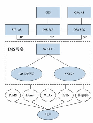 最上面一層是應用層,由應用和內容服務器組成,負責為用戶提供IMS增值業(yè)務,主要網元是一系列通過CAMEL、OSA/Parlay和SIP技術提供多媒體業(yè)務的應用平臺。運營商可以自行開發(fā)一些基于SIP的應用,通過標準SIP接口與IMS系統(tǒng)連接;如果運營商需要連接第三方SP的應用,IMS可以和標準的API,如OSAAPI連接,通過OSA/ParlayGW對第三方非信任的SP業(yè)務進行鑒權和管理等。