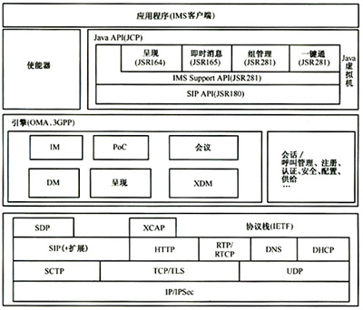 當(dāng)前的IMS技術(shù)工作主要集中在探討IMS網(wǎng)絡(luò)上,而忽視了對IMS客戶端的研究,然而,IMS客戶端才是最終用戶享受IMS技術(shù)帶來的諸多成果的最直接的表現(xiàn)方式。當(dāng)前還沒有統(tǒng)一的對IMS客戶端的定義,但根據(jù)作者的理解,可以將IMS客戶端定義為一個軟件包(包括了驅(qū)動程序、協(xié)議棧、各種引擎、應(yīng)用程序、人機界面等),并可運行在多種終端上(如移動終端、固定終端、PDA、臺式機、筆記本電腦等),可在IMS網(wǎng)絡(luò)架構(gòu)下提供多種實時與非實時IMS業(yè)務(wù)(如VoIP、視頻電話、呈現(xiàn)、即時消息、會議、組管理、一鍵通、協(xié)同工作、文檔共享等)和統(tǒng)一的用戶體驗,并且符合IETF、3GPP、OMA、JCP(Java community process,Java標(biāo)準(zhǔn)制定組織)等國際標(biāo)準(zhǔn)組織所規(guī)定的IMS相關(guān)規(guī)范。