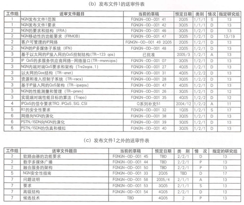 2005年5月之前,下一代網(wǎng)絡(luò)重點(diǎn)工作組已完成了計(jì)劃中的26個送審文件中的3個。所有的送審文件都必須指定專門的發(fā)布文件。遵循第13研究組的決定,下一代網(wǎng)絡(luò)重點(diǎn)工作組至少應(yīng)完成發(fā)布文件1的送審稿。表2給出了下一代網(wǎng)絡(luò)重點(diǎn)工作組按發(fā)布文件分類的送審件。