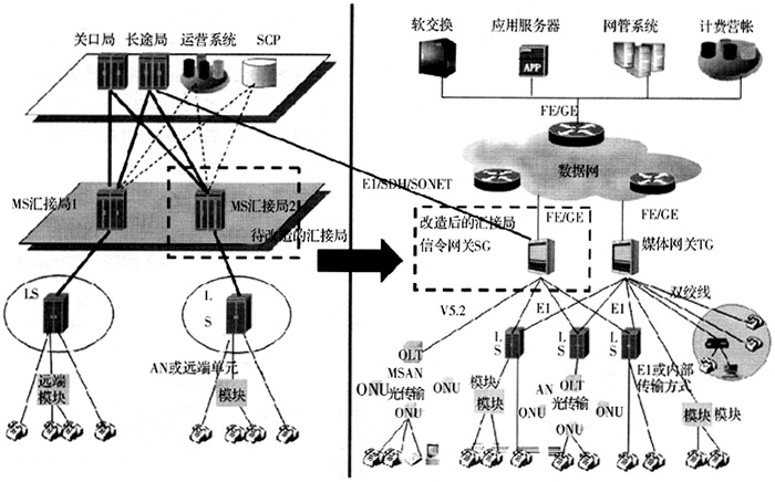 該方案改造后的端局上行鏈路通過接入網(wǎng)關(guān)AG接入到軟交換網(wǎng)絡(luò),下行鏈路利用原有端局已有的接入資源,支持雙絞線、V5、E1或MSTP等多種接入方式,實現(xiàn)語音、ISDN、DDN、DSL等業(yè)務(wù)的綜合接入。改造后端局的長途業(yè)務(wù)通過中繼網(wǎng)關(guān)TG和信令網(wǎng)關(guān)SG的方式與長途局或匯接局互通,信令網(wǎng)關(guān)完成電路交換網(wǎng)與IP網(wǎng)之間的SS7信令轉(zhuǎn)換功能,中繼網(wǎng)關(guān)在軟交換的控制下完成語音的媒體流轉(zhuǎn)換功能。