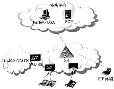 直接由SoftSwitch提供業(yè)務(wù),可提供基本電話業(yè)務(wù)、補(bǔ)充業(yè)務(wù)等;SoftSwitch具備SSP功能,通過SG與現(xiàn)網(wǎng)SCP互通,提供現(xiàn)有智能網(wǎng)業(yè)務(wù);SoftSwitch與應(yīng)用服務(wù)器之間通過SIP、H.323、Radius等協(xié)議互通;通過Parlay-GW/OSA-GW提供API接口,為第三方提供業(yè)務(wù)開發(fā)平臺(tái)。
