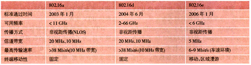 。。最早的IEEE802.16標(biāo)準(zhǔn)是在2001年12月獲得批準(zhǔn)的。目前所說的802.16標(biāo)準(zhǔn)主要包括802.16a、802.16d和802.16e三個標(biāo)準(zhǔn)。802.16e作為支持終端中低速移動的寬帶無線接入標(biāo)準(zhǔn),已于2006年初正式通過IEEE批準(zhǔn),這三個標(biāo)準(zhǔn)主要的特點見表1。
