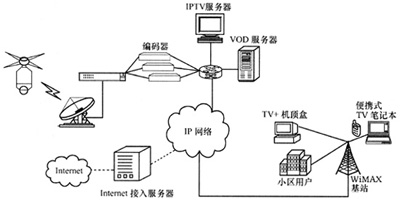 。。WiMAX網(wǎng)絡(luò)支持豐富多彩的業(yè)務(wù)模式。不同速率的數(shù)據(jù)業(yè)務(wù)是網(wǎng)絡(luò)的主要承載目標(biāo)。WiMAX支持不同的QoS級別,因此網(wǎng)絡(luò)覆蓋范圍與業(yè)務(wù)類型緊密相關(guān)。在IPTV的接入方面,由于IPTV需要高級別的QoS保證以及高速的數(shù)據(jù)傳輸速率,所以根據(jù)小區(qū)內(nèi)用戶的數(shù)量以及需求,合理設(shè)置WiMAX網(wǎng)絡(luò)。用戶接入IPTV網(wǎng)絡(luò)的時候。不需要再次進(jìn)行布線,只需加裝WiMAX接收設(shè)備和IP機(jī)頂盒即可,因此用戶可以方便、快捷地使用IPTV業(yè)務(wù)。WiMAX實現(xiàn)IPTV的接入如圖1所示。