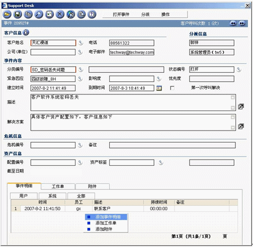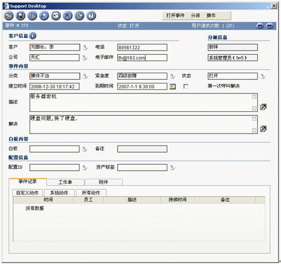 事件記錄應(yīng)該在某個(gè)服務(wù)臺(tái)工具中記錄和跟蹤,該工具最好是作為集成的服務(wù)管理工具集的構(gòu)成部分。該工具應(yīng)該在引發(fā)新的事件時(shí)提供最基本的事件記錄。比如為了幫助提高效率,當(dāng)你在天匯幫助臺(tái)的用于記錄事件的事件窗口中輸入請(qǐng)求發(fā)起者的姓名時(shí),利用客戶數(shù)據(jù)庫(kù)可以自動(dòng)填充諸如位置、部門和聯(lián)系詳細(xì)信息等字段。天匯幫助臺(tái)還支持使用計(jì)算機(jī)電話集成