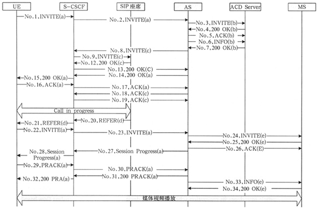 - No.33~34:AS根據(jù)用戶的相關(guān)信息去數(shù)據(jù)庫檢索所需媒體資源的文件名,并以INFO消息指示MS開始播放多媒體視頻;MS以200響應收到的INFO消息,根據(jù)INFO消息中攜帶的媒體文件名去資源服務器中獲取該資源,并播放該多媒體資源。