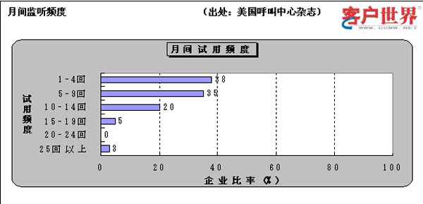 很多管理人感到頭疼的是,如何以監(jiān)聽(tīng)的方式計(jì)算品質(zhì)分?jǐn)?shù)。圖中顯示關(guān)于監(jiān)測(cè)頻度的調(diào)查結(jié)果。雖然判斷適當(dāng)?shù)谋O(jiān)聽(tīng)頻度也很重要,但最重要的是評(píng)價(jià)單上該填入哪些項(xiàng)目,這才是管理人最關(guān)心的事情。根據(jù)自己公司的狀況,選擇關(guān)于會(huì)話技能、業(yè)務(wù)知識(shí)、案件處理能力、技術(shù)水平、完成業(yè)務(wù)請(qǐng)求的程度等項(xiàng)目就可以。很多公司對(duì)外不公開(kāi)這些評(píng)價(jià)單,說(shuō)這屬于經(jīng)營(yíng)客服中心的經(jīng)驗(yàn)技術(shù),但從“友好競(jìng)爭(zhēng)”的角度看,在業(yè)內(nèi)公開(kāi)這種程度的“經(jīng)驗(yàn)技術(shù)”,不會(huì)構(gòu)成中心實(shí)力上的競(jìng)爭(zhēng)。