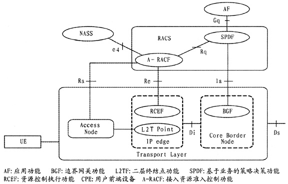 RACS是NGN的組成部分之一,將業(yè)務(wù)層的資源需求與網(wǎng)絡(luò)承載層的資源分配相關(guān)聯(lián),主要完成策略控制、資源預(yù)留、接納控制、網(wǎng)絡(luò)地址轉(zhuǎn)換(NAT)和防火墻穿越等功能。RACS通過(guò)一系列策略為應(yīng)用提供基于傳輸?shù)目刂品⻊?wù),只要該應(yīng)用支持RACS接口,RACS就能保證任意應(yīng)用能夠請(qǐng)求到與其服務(wù)相匹配的傳輸資源。同時(shí),RACS為運(yùn)營(yíng)商提供多種不同接納控制的方法,并設(shè)置各自的承載服務(wù)策略。RACS為各種服務(wù)提供獲得網(wǎng)絡(luò)資源的方法,使得用戶(hù)終端可以獲得所提供服務(wù),其總體功能結(jié)構(gòu)如圖3所示[5]。