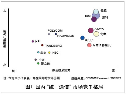“統(tǒng)一通信”與傳統(tǒng)通信的根本區(qū)別在于不僅僅是網(wǎng)絡(luò)的融合,也是應(yīng)用的融合。從這個(gè)層面來看,“統(tǒng)一通信”真正帶給用戶的是成本的降低、工作效率的提升以及整個(gè)運(yùn)行機(jī)制的改變!敖y(tǒng)一通信”是以人性化為特征應(yīng)用層面的融合,這種融合囊括了更多的內(nèi)容、覆蓋更廣闊的領(lǐng)域、具有更大的力量,它使得通信產(chǎn)業(yè)與IT產(chǎn)業(yè),通信設(shè)備商、軟件廠商與電信運(yùn)營商之間的邊界越來越模糊,跨行業(yè)、跨領(lǐng)域的聯(lián)盟與合作成為開拓市場(chǎng)的必需。但隨著眾廠商的紛紛加入,多款“統(tǒng)一通信”產(chǎn)品及解決方案的推出,“統(tǒng)一通信”市場(chǎng)展現(xiàn)出了勃勃生機(jī)和巨大的成長(zhǎng)潛力。在這些廠商中,有市場(chǎng)調(diào)研數(shù)據(jù)顯示思科市場(chǎng)份額領(lǐng)先,市場(chǎng)占有率高達(dá)35%。各類廠商之間既有競(jìng)爭(zhēng)又有合作,但還沒有一個(gè)廠商占絕對(duì)優(yōu)勢(shì)。實(shí)際上,“統(tǒng)一通信”市場(chǎng)上的競(jìng)爭(zhēng)者并不僅僅是這幾家巨頭,眾多網(wǎng)絡(luò)工具廠商、商用電話廠商也參與了這一競(jìng)爭(zhēng)平臺(tái)。幾乎所有和ICT有關(guān)的巨頭廠商都集中在了這個(gè)領(lǐng)域,“統(tǒng)一通信”正進(jìn)入群雄爭(zhēng)霸的時(shí)代。國內(nèi)“統(tǒng)一通信”市場(chǎng)競(jìng)爭(zhēng)格局如圖1所示。