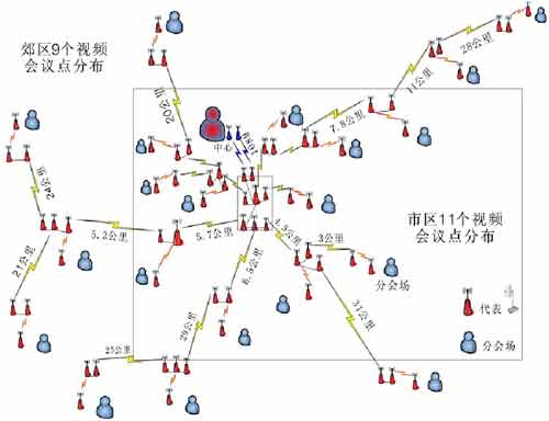 越來越多的企事業(yè)單位,已將無線寬帶視頻會議系統(tǒng)的建設提上了日程。以某單位無線寬帶視頻會議系統(tǒng)為例,其分支機構遍布上海市郊區(qū)達20個行政區(qū)劃,其中市區(qū)11個,郊區(qū)9個,非常分散,各點之間距離遠近不一。為提高辦事效率,實現(xiàn)各分支機構、各部門之間的協(xié)同工作,該單位決定建設視頻會議系統(tǒng),由于對網(wǎng)絡傳輸系統(tǒng)提出了極高的要求,在充分比較了各種技術方案的可行性與利弊后,最終決定選用無線寬帶技術構建視頻會議系統(tǒng)的傳輸網(wǎng)絡。