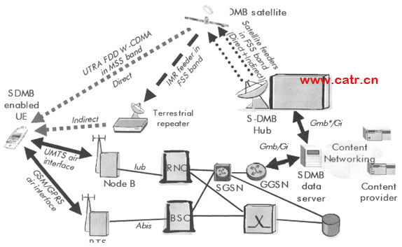 S-DMB Hub用于生成和傳輸S-DMB信號,將S-DMB信號調制到上行鏈路Ku波段載頻上,為衛(wèi)星提供信號。Hub包括一個Ku波段地面站,由NodeB的調制解調器提供信號,NodeB由RNC所控制。Hub還包括一個簡化的3G核心網設備,通過Gmb接口,與一個或者幾個3GPP規(guī)范定義的BM-SC連接。