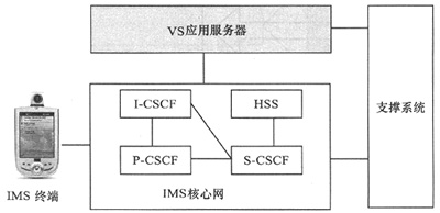 IMS的VS業(yè)務(wù)架構(gòu)如圖2所示,由IMS終端(支持SIP協(xié)議手機(jī))、IMS核心網(wǎng)、VS應(yīng)用服務(wù)器、支撐系統(tǒng)4部分構(gòu)成。IMS移動(dòng)終端提供了用戶使用VS業(yè)務(wù)的操作界面,包括VS業(yè)務(wù)發(fā)起、視頻播放、視頻存儲(chǔ)、VS業(yè)務(wù)應(yīng)答等功能。IMS核心網(wǎng)在支持視頻共享業(yè)務(wù)中,涉及到P-CSCF、S-CSCF、I-CSCF等網(wǎng)元,這些網(wǎng)元的作用是完成SIP移動(dòng)終端之間會(huì)話控制功能,包括會(huì)話的建立、會(huì)話的保存、會(huì)話的釋放等過(guò)程。VS應(yīng)用服務(wù)器是VS業(yè)務(wù)系統(tǒng)中最關(guān)鍵的功能實(shí)體,其功能包括對(duì)VS業(yè)務(wù)的請(qǐng)求進(jìn)行信令和媒體流的控制。由于基于IP的H.263協(xié)議能保證在較低的帶寬下傳送較高質(zhì)量的視頻流,因此首選H.263作為VS業(yè)務(wù)的視頻壓縮協(xié)議。此外,為了實(shí)現(xiàn)不同編碼能力的終端能進(jìn)行業(yè)務(wù)互通,VS應(yīng)用服務(wù)器還具備媒體編碼轉(zhuǎn)換的功能。VS應(yīng)用服務(wù)器另一重要的功能就是實(shí)現(xiàn)VS業(yè)務(wù)計(jì)費(fèi),它支持基于業(yè)務(wù)計(jì)費(fèi)、事件計(jì)費(fèi)、時(shí)間計(jì)費(fèi),流量計(jì)費(fèi)等多種靈活的計(jì)費(fèi)方式,并生成計(jì)費(fèi)話單。支撐系統(tǒng)的功能主要是實(shí)現(xiàn)VS業(yè)務(wù)定購(gòu)、業(yè)務(wù)取消、計(jì)費(fèi)話單的收集匯總等。