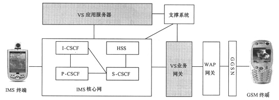 由于GSM網(wǎng)絡(luò)不可能立刻被替換掉,因此在一段時(shí)期內(nèi)會(huì)出現(xiàn)3G IMS網(wǎng)絡(luò)和GSM網(wǎng)絡(luò)共存的局面。VS作為IMS中的典型業(yè)務(wù)將隨著IMS網(wǎng)絡(luò)的部署得到大力推廣,此時(shí)會(huì)出現(xiàn)基于SIP協(xié)議的IMS終端用戶和GSM用戶終端進(jìn)行VS業(yè)務(wù)互通的需求,下文將對(duì)這種業(yè)務(wù)需求的實(shí)現(xiàn)方案進(jìn)行詳細(xì)介紹。
