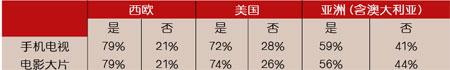 Ovum還詢(xún)問(wèn)了被調(diào)查者對(duì)于手機(jī)電視和電影大片的看法,對(duì)于這兩項(xiàng)業(yè)務(wù),正面積極的回應(yīng)率很低,很少有人愿意支付額外費(fèi)用來(lái)購(gòu)買(mǎi)手機(jī)電視或是精彩大片,但是也有被調(diào)查者表示愿意接受廣告以換取免費(fèi)的電視和電影內(nèi)容。