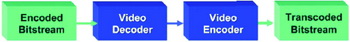 視頻轉碼是一個高運算負荷的過程,需要對輸入的視頻流進行全解碼、視頻過濾/圖像處理、并且對輸出格式進行全編碼。最簡單的轉碼過程(圖3)僅僅涉及到解碼一個比特流和用不同的編解碼器重新編碼兩個步驟。這種硬轉碼看似很簡單,只需要一個解碼器和一個編碼器,但是最終顯示結果并不理想,因為視頻數(shù)據(jù)解碼后重新編碼會降低畫質。