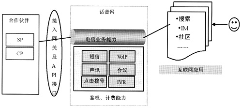 用戶不再是直接通過電話終端使用話音應用,而是通過PC(或PDA等)在互聯(lián)網(wǎng)應用中使用話音業(yè)務,因此操作界面非常友好,互聯(lián)網(wǎng)應用在后臺通過調(diào)用電信業(yè)務平臺的接口能力使用話音網(wǎng)絡(luò)資源能力,這些網(wǎng)絡(luò)資源能力包括VoIP、點擊撥號、短信、多方會議、聲訊、IVR等,因此話音網(wǎng)資源借助豐富的互聯(lián)網(wǎng)應用激發(fā)了潛力。