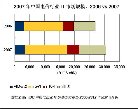 IDC《中國電信行業(yè)IT解決方案市場2008-2012年預(yù)測與分析》報告的數(shù)據(jù)顯示,2007年中國電信行業(yè)整體IT支出規(guī)模為305.02億元人民幣,比2006年增長了13.2%。2007年電信行業(yè)IT運營支撐系統(tǒng)和增值業(yè)務(wù)系統(tǒng)的高速增長主要是由于運營商都在為3G的實施和全業(yè)務(wù)運營做準備。