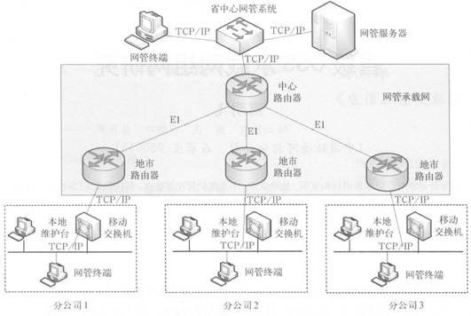 同樣以移動(dòng)網(wǎng)為例,例子中移動(dòng)交換機(jī)到維護(hù)終端支持TCP/IP方式,分公司具有本地維護(hù)終端和網(wǎng)管終端兩種類(lèi)型的維護(hù)臺(tái)。本地維護(hù)終端通過(guò)以太交換機(jī)直接與移動(dòng)交換機(jī)相連;網(wǎng)元和網(wǎng)管終端通過(guò)以太網(wǎng)接入邊緣路由器,經(jīng)路由器接.el轉(zhuǎn)化以El方式接入到時(shí)隙抽取設(shè)備中,由于傳送網(wǎng)管信息占用帶寬較小,