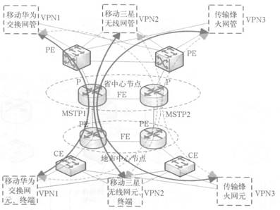 采用MPLS VPN技術(shù)可以把現(xiàn)有的物理實(shí)體IP網(wǎng)絡(luò)分解成邏輯上隔離的網(wǎng)絡(luò),各隔離開(kāi)的網(wǎng)絡(luò)之間感知不到對(duì)方網(wǎng)絡(luò)的存在。在物理上是同一硬件設(shè)備承載,但在邏輯上網(wǎng)絡(luò)是完全隔離的。0SS承載網(wǎng)正是需要這樣的一種承載方式,把各專(zhuān)業(yè)各廠家的多種網(wǎng)管配置到不同的邏輯業(yè)務(wù)區(qū)VPN中,如移動(dòng)華為交換網(wǎng)管配置到VPNl中,移動(dòng)三星無(wú)線(xiàn)網(wǎng)管配置到VPN2中,傳輸烽火網(wǎng)管配置到VPN3中,對(duì)每一套網(wǎng)管系統(tǒng)都使用同樣的物理承載不同的VPN完成從地市分公司的網(wǎng)元或終端到網(wǎng)管服務(wù)器的連接,各VPN之間相互獨(dú)立、相互隔離。