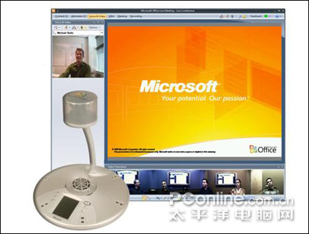 微軟Office RoundTable,音頻-視頻協(xié)作設備,帶有一個獨特的 360 度相機。在結合 Office Communications Server 2007 使用時,RoundTable 還可交付卓越的會議體驗:將會議環(huán)境擴展到多個位置,F(xiàn)場及遠程位置的與會人員可以全景查看會議室中的每位成員,還可以在輪流發(fā)言時拉近特寫某個與會者。