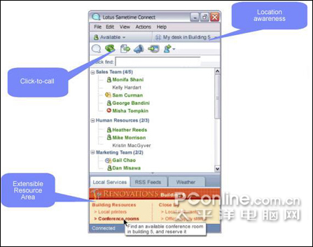 Sametime Advanced的即時共享功能使用戶能夠啟動屏幕或應用分享會話,并支持其他參與者“驅動”并修改文檔。此外,用戶還能夠事先安排同事的位置,突出顯示用戶位置和離線聯(lián)系人上次出現(xiàn)的位置,節(jié)約時間和精力。