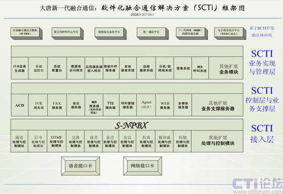 案例:我與大唐中聯(lián)(大唐融合)、和創(chuàng)世紀、華夏成訊等公司的技術(shù)開發(fā)人員經(jīng)過幾年來的摸索與實踐開發(fā),提出軟件化融合通信解決方案(SCTI)。通過計算機的軟件(通信服務系統(tǒng))來實現(xiàn)交換機上的所有通信功能,在互聯(lián)網(wǎng)上實現(xiàn)所有傳統(tǒng)通信網(wǎng)上的所有功能、還實現(xiàn)互聯(lián)網(wǎng)上的新的通信功能,在與傳統(tǒng)通信網(wǎng)上相連,只需增加一塊語音接口卡,就能實現(xiàn)互聯(lián)網(wǎng)與傳統(tǒng)通信的統(tǒng)一。此方案的成本比統(tǒng)一通信、融合通信等解決方案的成本要降幾十倍到上百倍。
