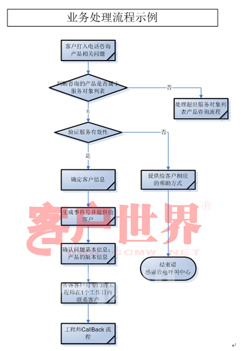 流程建設(shè)往往包含以下內(nèi)容:   業(yè)務處理流程:是一個流程體系。它描述了呼叫中心如何為客戶提供服務的詳細步驟。從座席處理每一個交易開始(例如接聽電話,接受電子郵件,進行網(wǎng)上聊天聯(lián)系等)到交易的結(jié)束,所有動作都受業(yè)務處理流程所指導。