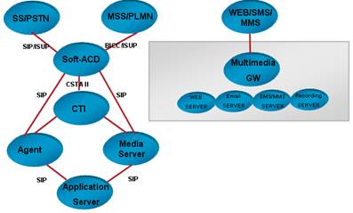 目前市場最常見的第三代呼叫中心是傳統(tǒng)的基于TDM的呼叫中心,應(yīng)用了計算機電話集成(CTI)技術(shù)。隨著網(wǎng)絡(luò)的普及和NGN的發(fā)展,出現(xiàn)第五代呼叫中心NGCC。NGCC是以NGN為基礎(chǔ)構(gòu)建的呼叫中心系統(tǒng),核心控制設(shè)備處理呼叫的能力較傳統(tǒng)呼叫中心大幅提高。NGCC的網(wǎng)絡(luò)架構(gòu)和接口如圖3所示。