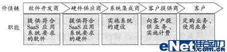 在傳統(tǒng)的軟件開發(fā)模式下,客戶建設(shè)IT系統(tǒng)需要直接面對(duì)軟件開發(fā)商、硬件提供商、集成商和售后技術(shù)支持,系統(tǒng)建設(shè)周期長(zhǎng)、初期投入大。在SaaS模式下,客戶只需要與服務(wù)提供商發(fā)生關(guān)聯(lián),在向服務(wù)提供商定購(gòu)業(yè)務(wù)后,客戶無需關(guān)注系統(tǒng)的軟件和硬件,可以直接使用業(yè)務(wù)。從客戶角度,從傳統(tǒng)模式發(fā)展到SaaS模式,價(jià)值鏈由并行轉(zhuǎn)變?yōu)榇。從ASP模式發(fā)展到SaaS模式,則出現(xiàn)了新的價(jià)值鏈角色服務(wù)提供商。SaaS模式下價(jià)值鏈的組成如圖3所示。