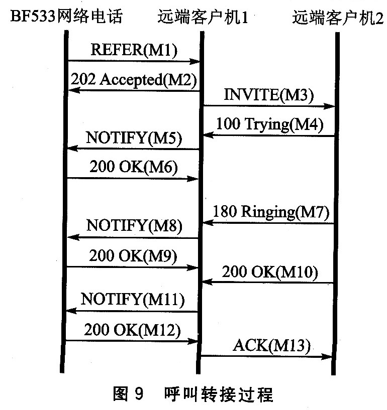 該過程是通過擴展的SIP信令REFER來完成的,交互過程如圖9所示。當(dāng)BF533網(wǎng)絡(luò)電話要將它和遠端客戶機1(RCl)的通話轉(zhuǎn)接到遠端客戶機2(RC2)時,BF發(fā)送REFER(M1)給RCl,該信息中Refer—To字頭標明了RC2的URL,之后RCl回復(fù)202
