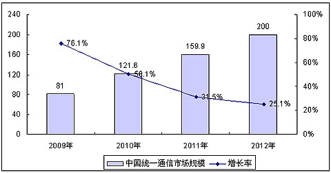 賽迪顧問預測,伴隨著全球經濟的逐漸復蘇和企業(yè)對統(tǒng)一通信產品認識與需求的持續(xù)增長,2009年中國統(tǒng)一通信市場將出現加速增長的趨勢,全年市場規(guī)模將達81億元,同比增長76.1%,至2012年,中國統(tǒng)一通信整體市場規(guī)模將達200億元,平均年增長率超過30%。