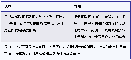 IPTV目前遇到的廣電阻力,主要源于和廣電有線網(wǎng)絡公司所推進的數(shù)字電視的業(yè)務競爭,而有線網(wǎng)絡通過和廣電局的關(guān)聯(lián)關(guān)系,引發(fā)IPTV政策干擾和內(nèi)容屏蔽。