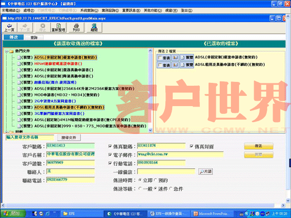 客戶服務(wù)中心經(jīng)常需要以書面的窗口或文件與客戶往來,過去我們并未將這些窗口、文件電子化和自動(dòng)化,客服人員為送收文件需要離開座席去操作傳真機(jī),不僅浪費(fèi)時(shí)間(來回操作一次約需2~3分鐘)。而我們發(fā)展「EFE輕松傳e化平臺(tái)」計(jì)劃,就是將傳真、電子郵件和SMS(簡訊)三種功能整合為一個(gè)e化的客戶互動(dòng)平臺(tái)。