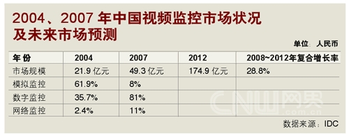 IDC的數(shù)字同樣樂觀。跟據(jù)IDC在2008年的預測,2008~2012年,中國視頻監(jiān)控市場的年均復合增長率將達28.8%,遠高于IT市場投入的平均增長率。而在模擬、數(shù)字與IP模式(即網(wǎng)絡監(jiān)控)組成的視頻監(jiān)控市場里,IP的增長率又將高于前二者,成為市場增長的強勁動力。”(注:模擬監(jiān)控是指圖像信號在采集后,通過模擬信號傳輸?shù)姆忾]式視頻監(jiān)控系統(tǒng)模式;數(shù)字監(jiān)控是指圖像信號在采集后,經(jīng)過編碼轉化成數(shù)字信號再進行傳輸?shù)姆忾]或半封閉式視頻監(jiān)控系統(tǒng)模式;網(wǎng)絡監(jiān)控是指系統(tǒng)建立在以網(wǎng)絡為基礎的傳輸平臺的開放式視頻監(jiān)控系統(tǒng)模式)。