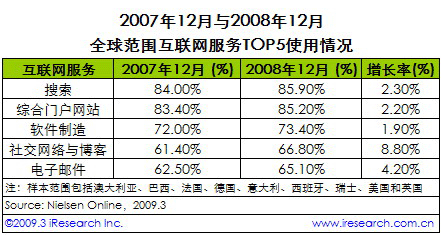 iResearch艾瑞咨詢根據(jù)NielsenOnline公布的全球范圍內(nèi)排名前五位的互聯(lián)網(wǎng)服務(wù)使用情況發(fā)現(xiàn),2008年在全球范圍內(nèi),社交網(wǎng)絡(luò)與博客的發(fā)展最為迅速。數(shù)據(jù)顯示,在包括搜索、綜合門戶網(wǎng)站、軟件制造、社交網(wǎng)絡(luò)與博客以及電子郵件在內(nèi)的五項(xiàng)互聯(lián)網(wǎng)服務(wù)中,相對(duì)2007年12月,2008年12月社交網(wǎng)絡(luò)與博客的使用情況增長(zhǎng)率最高,達(dá)8.8%。而搜索、綜合門戶網(wǎng)站、軟件制造的增長(zhǎng)率,分別為2.3%、2.2%、1.9%,均不足社交網(wǎng)絡(luò)與博客增長(zhǎng)率的二分之一。高增長(zhǎng)帶動(dòng)社交網(wǎng)絡(luò)與博客服務(wù)在2008年12月以66.8%的使用率反超電子郵件(65.1%),躍居TOP5網(wǎng)絡(luò)服務(wù)第四位。