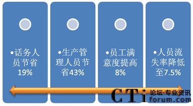 專席將復雜的、疑難的業(yè)務承擔起來,前臺員工平均通話時長由專席設(shè)置前的82秒壓縮到目前的67秒。由于通話時長的縮短,節(jié)省了大量人力資源,江蘇移動10086客服中心全年減少226名客戶代表人工成本和156個臺席成本,年節(jié)省人工成本591萬元和臺席投資費用611萬。