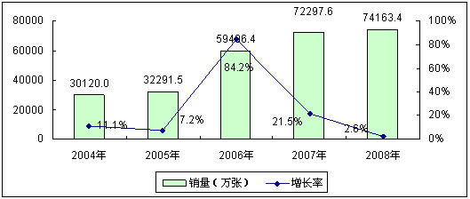 圖2 2004-2008年中國(guó)移動(dòng)通信卡市場(chǎng)規(guī)模與增長(zhǎng)(按銷量)