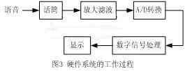 該系統(tǒng)以TMS320VC5402為核心電路,對(duì)孤立詞語(yǔ)音信號(hào)進(jìn)行采集和處理,AIC為TMS320VC5402的模擬接口電路,包括放大、濾波、和A/D轉(zhuǎn)換的電路,把由話筒采集進(jìn)來(lái)的模擬語(yǔ)音信號(hào),轉(zhuǎn)換成數(shù)字語(yǔ)音信號(hào)。其中SRAM和Flash分別為TMS 320VC5402的數(shù)據(jù)存儲(chǔ)器和程序存儲(chǔ)器。鍵盤和顯示部分則由AT89S52來(lái)控制,AT89S52把鍵盤操作轉(zhuǎn)換為控制信號(hào)再傳送給TMS320VC5402,控制系統(tǒng)的工作是訓(xùn)練還是識(shí)別,TMS320VC5402把要顯示的系統(tǒng)狀態(tài)通訊給AT89S52,以實(shí)現(xiàn)LCD顯示。這些硬件工作過(guò)程如圖3所示。