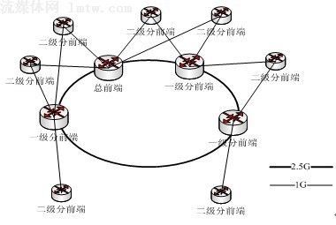 某廣電現(xiàn)有網(wǎng)絡(luò)環(huán)境如下圖所示,總前端及其他一級(jí)分前端處于骨干光纖環(huán)網(wǎng)上,另有若干個(gè)二級(jí)分前端分別通過(guò)光纖雙上聯(lián)至骨干環(huán)網(wǎng)上的總前端或一級(jí)分前端中的兩個(gè)物理節(jié)點(diǎn)。所有物理節(jié)點(diǎn)均帶有一定數(shù)量的終端用戶。