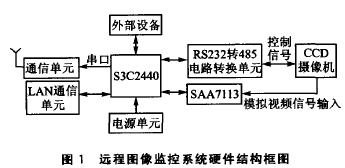 本系統(tǒng)采用三星公司的S3C2440嵌入式處理器和arm-linux2.4.26操作系統(tǒng);S3C2440使用ARM920T內(nèi)核,主頻是400MHz;除了集成通用的串口控制器、USB控制器、A/D轉(zhuǎn)換器和GPIO等功能之外,還集成了一個攝像頭接門(CAMIF)(這個接口是遠(yuǎn)程圖像采集的核心部分)。系統(tǒng)在S3C2440處理器的控制下,從CCD攝像機采集模擬視頻信號,然后經(jīng)過編碼、DMA傳輸?shù)絻?nèi)存緩沖,接著由軟件對內(nèi)存中的數(shù)字視頻數(shù)據(jù)進(jìn)行壓縮和打包.最后通過通信單元將圖像以IP包的方式發(fā)送到監(jiān)控中心的服務(wù)器。整個系統(tǒng)的硬件結(jié)構(gòu)原理如圖1所示