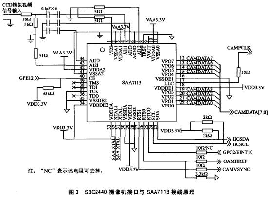 4:2:2格式。對SAA7113初始化需要通過I2C 總線進(jìn)行,而S3C2440內(nèi)部集成的I2C控制器正好可以實現(xiàn)這個過程。S3C2440的攝像機接口與SAA7113的連接原理如圖3所示。