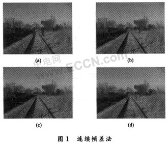 綜合考慮以上四種背景提取方法,本文采用結(jié)合多幀圖像平均法和連續(xù)幀差法這兩種方法來進行視頻序列背景的提取。考慮到運動目標(biāo)的多樣性,有目標(biāo)經(jīng)過視場而引起的變化長時間內(nèi)可忽略不計。多幀圖像平均法時將運動目標(biāo)看作為噪聲,用累加平均的方法消除噪聲,利用目標(biāo)運行一段時間的序列圖像進行平均而得到視場背景圖像。連續(xù)幀差算法是通過當(dāng)前幀的圖像與前一幀圖像的差值找到運動區(qū)域,對運動區(qū)域的背景保持不變,而非運動區(qū)域的背景則用當(dāng)前幀進行更新,經(jīng)過一段時間的迭代便可提取出背景。兩種方法的結(jié)合可以很好地彌補各自的缺點,能夠適應(yīng)鐵路沿線周邊環(huán)境的要求,對存在運動目標(biāo)的背景能夠提取出質(zhì)量較高的背景圖像。具體過程如下: