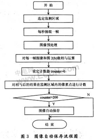 由于視頻拍攝的位置是平行于地面,所以拍攝到的視場很寬廣。如果對拍到的整個鐵路線進行監(jiān)控,那么周圍環(huán)境會對圖像處理帶來很大的干擾。所以為了達(dá)到較好的監(jiān)控效果,只考慮沿線的某一塊區(qū)域,本文選定的監(jiān)測區(qū)域是:行的位置從346~386的像素點,列的位置從341~370的像素點。待監(jiān)測的視頻是25幀/s,每秒鐘從視頻中抽取一幀進行監(jiān)測。對于每一幀待監(jiān)測的圖像首先要進行圖像的預(yù)處理,處理步驟包括有轉(zhuǎn)換為灰度圖、二值化、圖像膨脹等。把預(yù)處理后的圖像和圖2(b)做相與運算,然后對得到的結(jié)果圖像在監(jiān)測區(qū)域內(nèi)進行像素統(tǒng)計。
