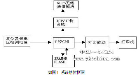 系統(tǒng)整體框架如下,為了控制整個系統(tǒng)穩(wěn)定運行,系統(tǒng)需要一個微處理器,為了打印出一張憑證,系統(tǒng)需要一個微型打印機。因為系統(tǒng)需要通過無線的方式接入Internet,所以該系統(tǒng)還需要一個無線通信模塊,該通訊模塊可以接入Internet,選用GPRS 通信模塊或者CDMA 通訊模塊。為了接入Internet,僅僅有一個通訊模塊還不行,還需要遵循Internet 的共有通信協(xié)議。這樣改系統(tǒng)有好幾種組合方式,本系統(tǒng)選用內(nèi)嵌TCP/IP 協(xié)議棧的CPU。采用MCU 及固化了TCP/IP 協(xié)議的芯片組成應(yīng)用系統(tǒng)的核心,應(yīng)用系統(tǒng)可以直接上網(wǎng),硬件電路相對簡單。該方案具有如下優(yōu)點;①不依賴PC 機或高檔單片機,真正實現(xiàn)8 位單片機系統(tǒng)直接接入Internet,整個系統(tǒng)完全自給自足;②使用外圍器件少,系統(tǒng)成由低。